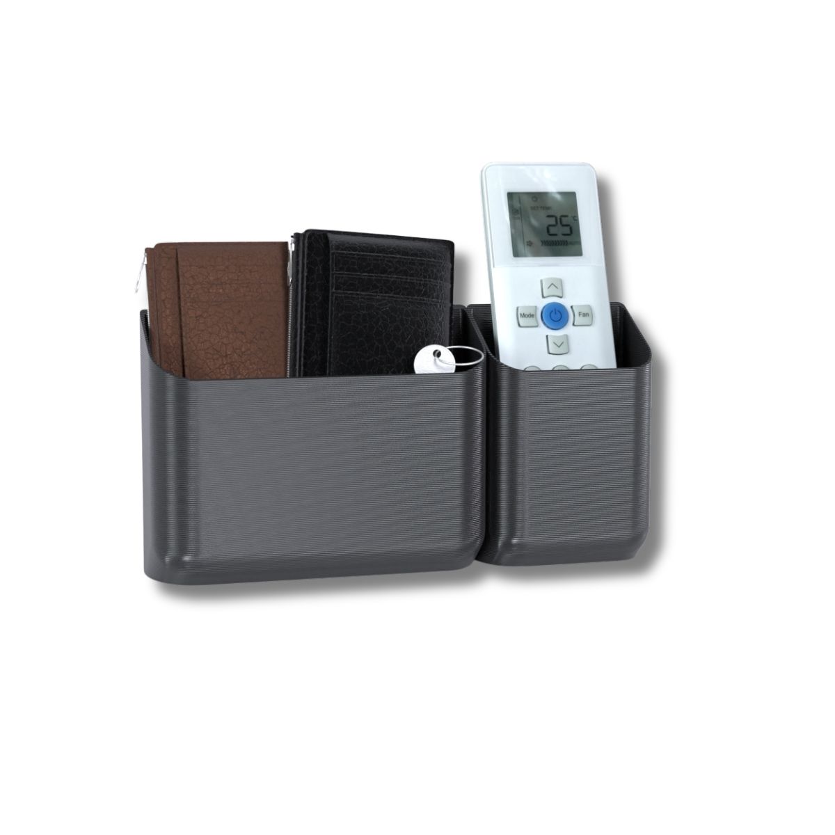 Disponível na cor preta, o kit se adapta facilmente a diferentes estilos de decoração, oferecendo um visual moderno e sofisticado. Ele permite que controles remotos, carteiras e acessórios sejam armazenados de forma ordenada e acessível.