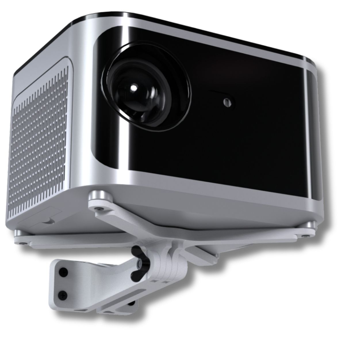 Disponível na cor branca, o suporte angulável se adapta facilmente à estética de qualquer ambiente, proporcionando uma aparência moderna e discreta. Com o suporte angulável, o projetor é posicionado de forma fixa, eliminando a necessidade de ocupação de espaço em mesas ou prateleiras, o que contribui para a organização do ambiente.